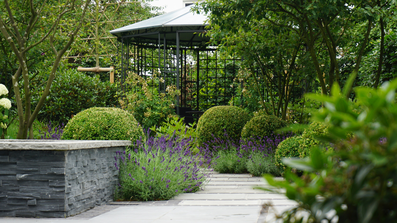 Die Felsenbirne, die bereits im Garten wuchs, gab den Impuls für ein kleines Wäldchen aus vier Felsenbirnen, durch das sich ein Weg zu dem hinteren Gartenbereich schlängelt. Ein überdachter Pavillon sorgt dort für einen schattigen Sitzplatz. Der vorderen sonnige Gartenbereich wird zum Grillen, Essen und Sonnen genutzt. Dieser Platz ist seitlich durch eine 2 m hohe Mauer und Rotbuchen in Spalierform eingefasst. Für die Wege und Plätze wurden Platten aus Feinsandstein, Keramik und Pflasterklinker verwendet.